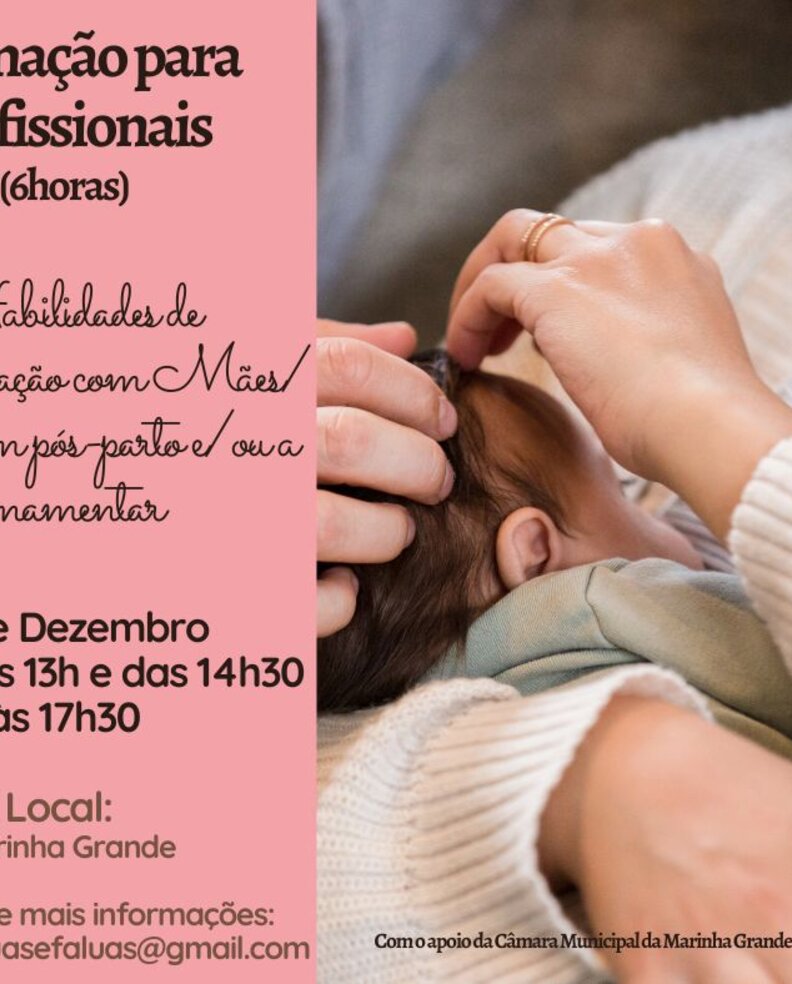 Irá ter lugar uma formação no próximo dia 20 de dezembro, das 10h às 17h30, na Marinha Grande, dirigida a profissionais que contactam com famílias em pós parto - Habilidades de comunicação com Mães/ Famílias em Pós-parto e/ ou a Amamentar.