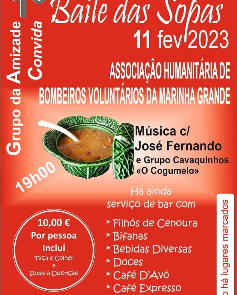 O Grupo de Amizade associa-se à direção da Associação Humanitária de Bombeiros Voluntários da Marinha Grande para o 1º Baile das Sopas, a 11 de fevereiro de 2023, pelas 19h00, nas instalações dos Bombeiros Voluntários.