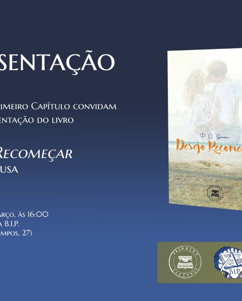A BIP e a Primeiro Capítulo convidam para a apresentação do livro "Desejo Recomeçar" de P. C. Sousa, que ocorre a 4 de março, às 16h00, no Auditório da Biblioteca de Instrução Popular (Rua Pires de Campos, 27), na Vieira de Leiria.
