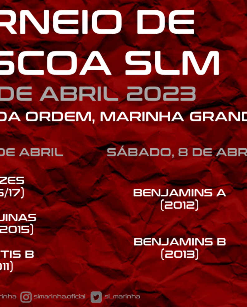 A 7 e 8 de abril decorre o Torneio de Páscoa Sport Lisboa e Marinha. Com início às 09h00, o evento tem lugar no Campo de jogos do Sport Lisboa e Marinha, na Ordem, Marinha Grande.