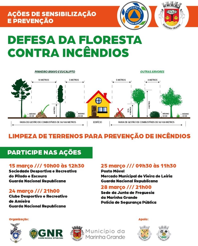 A Câmara Municipal da Marinha Grande, através do Serviço Municipal da Proteção Civil, organiza ações de sensibilização o âmbito da defesa da floresta contra incêndios, nos dias 15, 24, 25 e 28 de março.