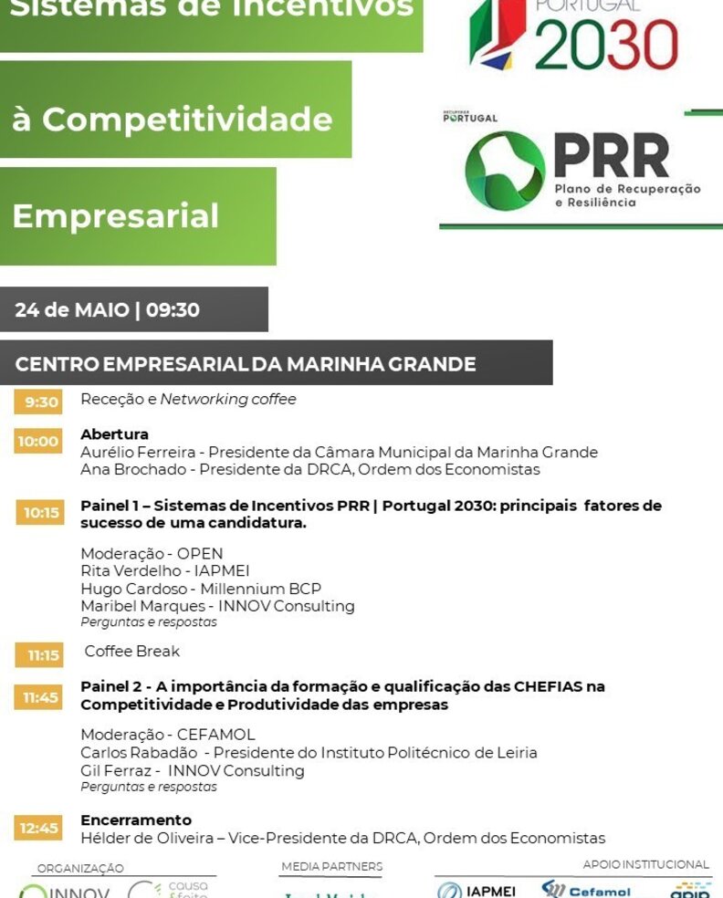 No âmbito do Portugal 2030 e do Plano de Recuperação e Resiliência (PRR), tem lugar, a 24 de maio, a partir das 9h30, a conferência "Sistemas de Incentivos à Competitividade Empresarial", no Centro Empresarial da Marinha Grande.