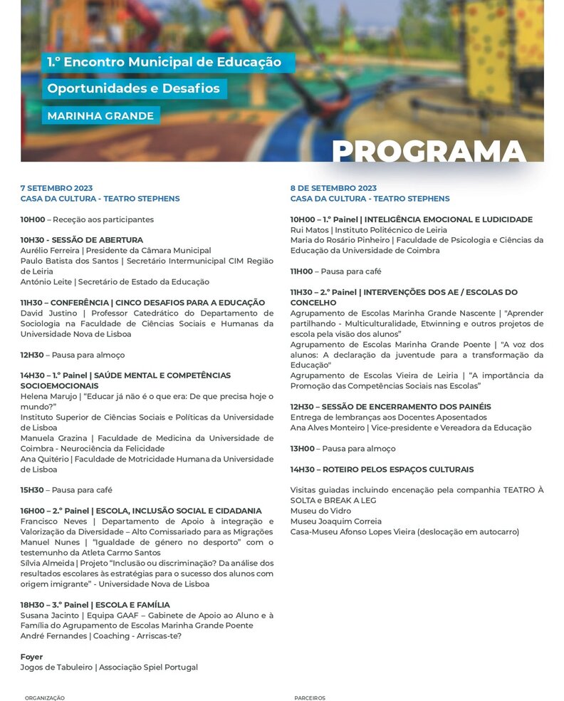 O Município da Marinha Grande realiza o “1º Encontro Municipal de Educação - Oportunidades e Desafios”, nos dias 7 e 8 de setembro, na Casa da Cultura Teatro Stephens, reunindo oradores conceituados a nível nacional, que irão debater o futuro da educação.