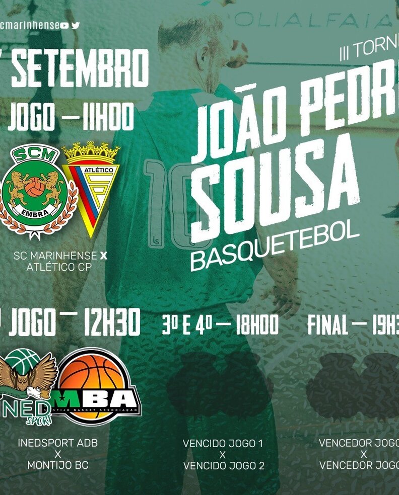 Ocorre no próximo domingo, 17 de setembro, o 3º Torneio de Basquetebol "João Pedro Sousa" - Séniores. O Sporting Clube Marinhense recebe as equipas Atlético CP, INEDSports ADB e Montijo BA para a 3ª edição deste torneio.