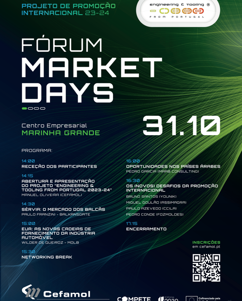 No âmbito do seu projeto de promoção internacional “Engineering & Tooling from Portugal”, a CEFAMOL organiza no próximo dia 31 de outubro o evento Market Days dedicado à análise e debate de oportunidades para o alargamento da base exportadora do sector.