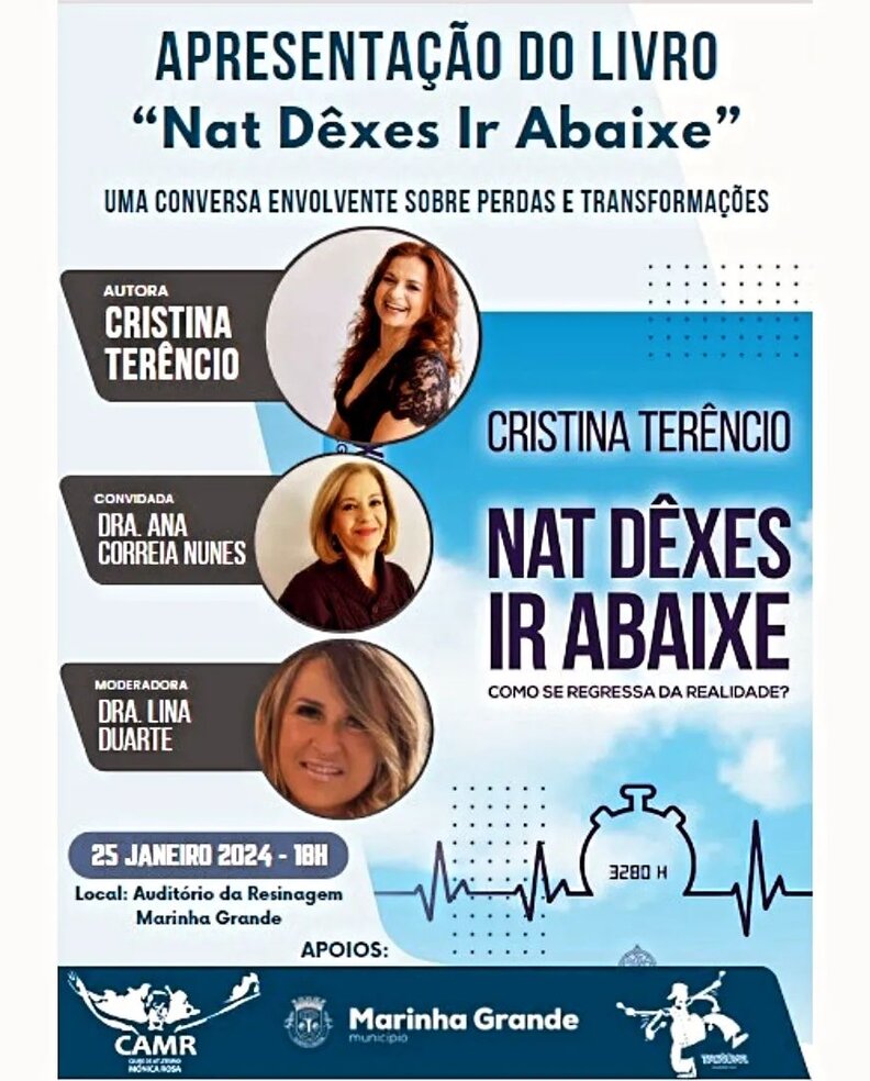 Trata-se de uma palestra/conversa partilhada por uma mãe que perdeu o filho na noite de Natal e que tomou a iniciativa de fundar uma associação cujo objectivo é auxiliar pessoas que passem pela mesma experiência e de continuar a viver escrevendo um livro que versa o mesmo tema, trocando ideias com uma psicóloga especializada na área das perdas e comportamentos humanos, voluntária da Associação e a nossa Marinhense Lina Duarte que será a moderadora. Juntem-se a nós numa tarde fantástica de partilha. A receita da venda do livro reverte a favor da compra de material ortopédico para pessoas com necessidades materiais.