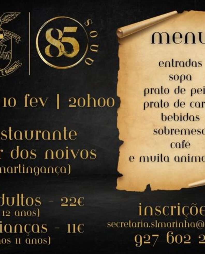 Dia 10 de fevereiro as 22h00 a SLMarinha, ira realizar um Jantar comemorativo para o 85º Aniversário da instituição!