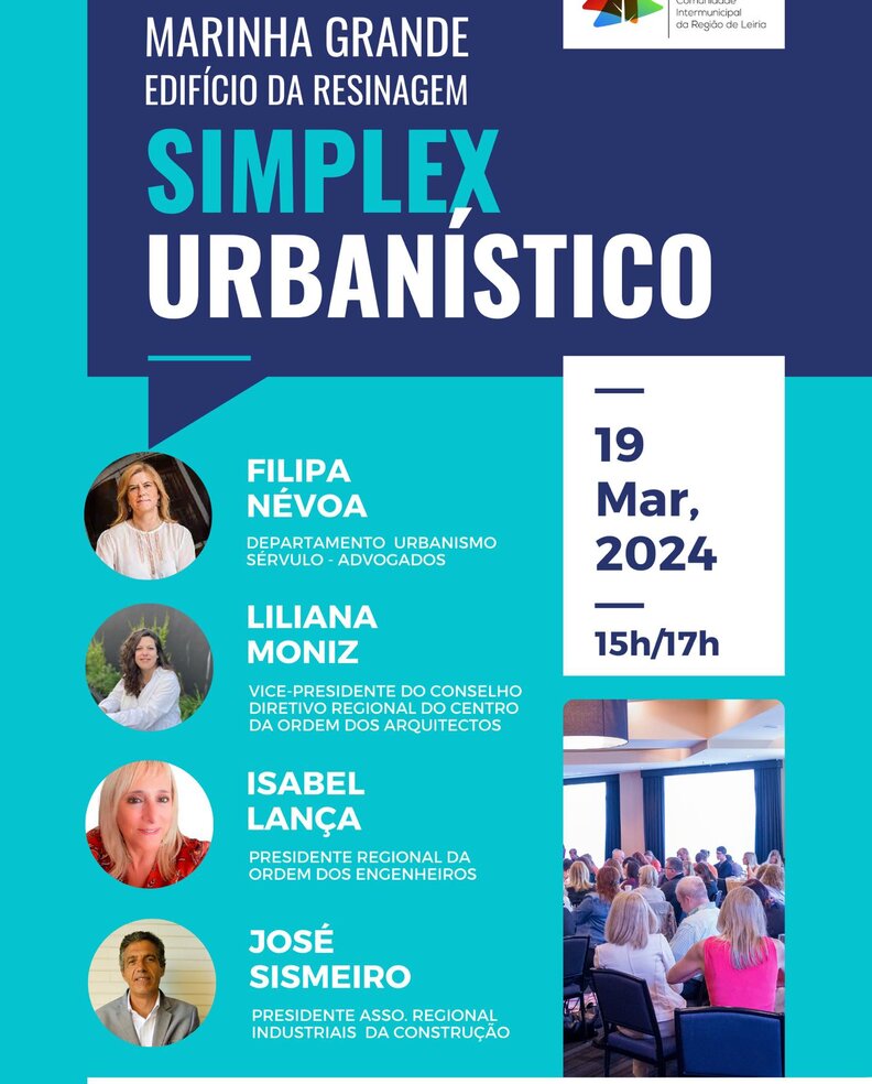 📍No próximo dia 19 de março, às 15h00, vamos realizar a Conferência sobre o «Simplex Urbanístico», orientada para as lideranças dos 10 municípios da região de Leiria, profissionais, promotores e técnicos do urbanismo, a realizar pelas 15h, no Auditório do Edifício da Resinagem, na cidade da Marinha Grande.