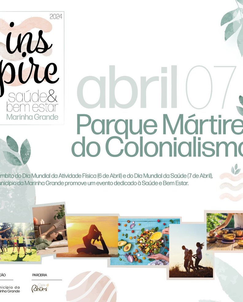 O Município da Marinha Grande vai comemorar o Dia Mundial da Atividade Física (6 de abril) e o Dia Mundial da Saúde (7 de abril), com a atividade “INSPIRE - Saúde e Bem Estar”, que decorre no dia 7 de abril (domingo), das 10h00 às 18h00, no Parque Mártires do Colonialismo.