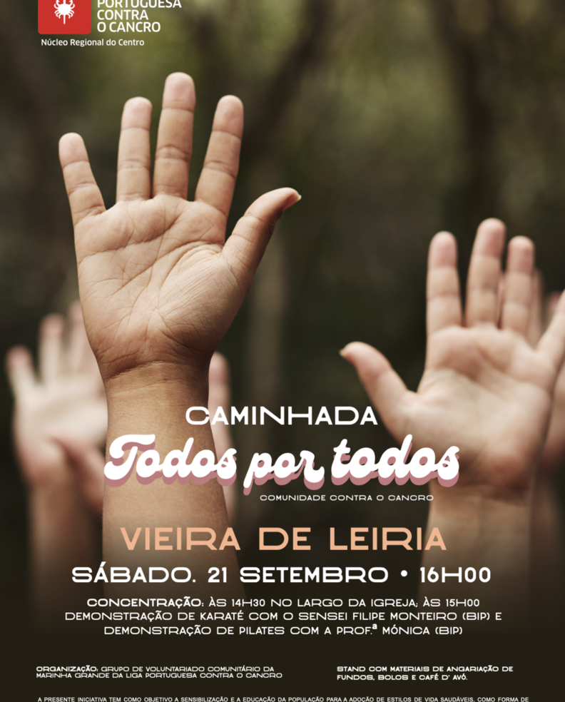 A iniciativa tem como objetivo sensibilizar a população para a adoção de estilos de vida saudáveis, como forma de promoção da saúde e prevenção do cancro e angariar fundos para o apoio ao doente oncológico e família. Esta caminhada, com a concentração dos participantes no Largo da República, em Vieira de Leiria, vai contar com demonstrações de Pilates e Karaté, bem como um stand com materiais de angariação de fundos, bolos e café, no espaço acima referido.