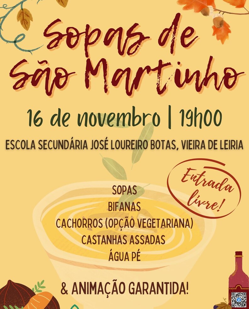 Junta-te a nós nestas Sopas de S. Martinho! Teremos diferentes sopas, castanhas assadas 🌰 e água pé, bifanas, cachorros 🌭 (há opção vegetariana!) e muita animação! 🤩