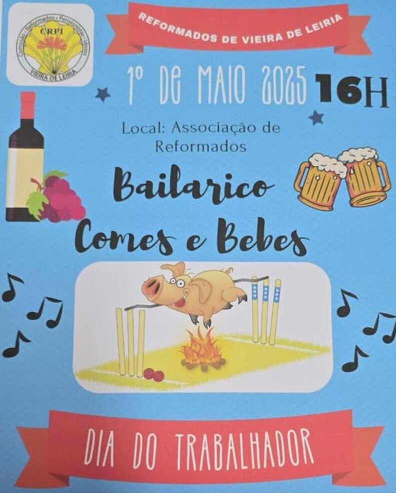 No dia 1 de maio vai ter início pelas 16h um convívio em comemoração ao Dia do Trabalhador na associação de reformados de Vieira de Leiria.