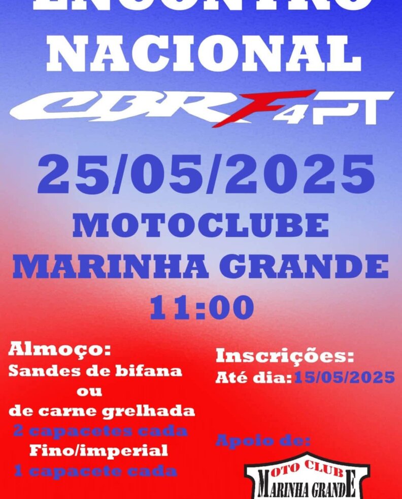 O Motoclube da Marinha Grande será palco do Encontro Nacional CBR4PT, um evento dedicado aos entusiastas das motas CBR e à comunidade motociclista em geral. Este encontro promete um dia de convívio, motores e boa disposição.