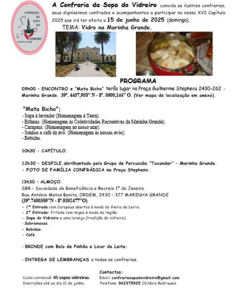 A Confraria da Sopa do Vidreiro realiza o seu XVI Capítulo no dia 15 de junho de 2025 (domingo), na Marinha Grande, com o tema “Vidro na Marinha Grande”.