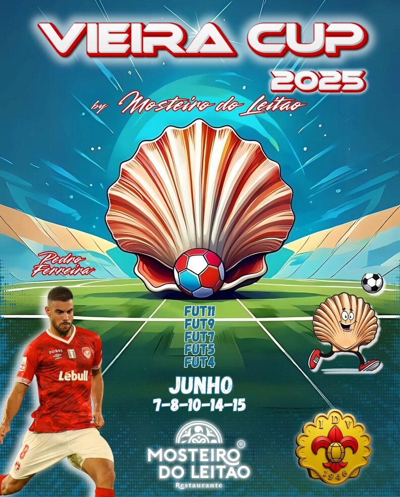 𝐕𝐢𝐞𝐢𝐫𝐚𝐂𝐮𝐩 𝟐𝟎𝟐𝟓 irá realizar-se nos dias 7-8-10-14-15 de Junho, no Estádio Albano Tomé Feteira, na Vieira de Leiria, contando com Pedro Ferreira (jogador formado no ID Vieirense, atualmente a jogar no Santa Clara) como padrinho deste Torneio, que já se encontra esgotado.
