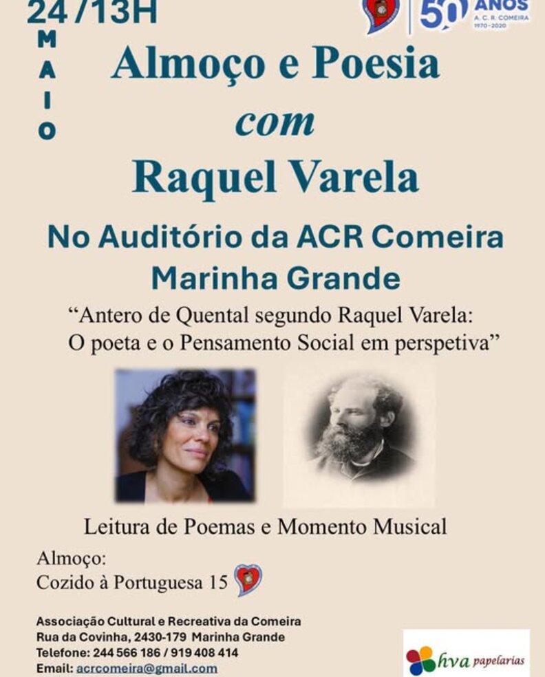No dia 24 de maio, às 13h, a ACR Comeira, na Marinha Grande, promove o evento “Almoço e Poesia com Raquel Varela”, com destaque para a palestra “Antero de Quental segundo Raquel Varela: O poeta e o Pensamento Social em perspetiva”.