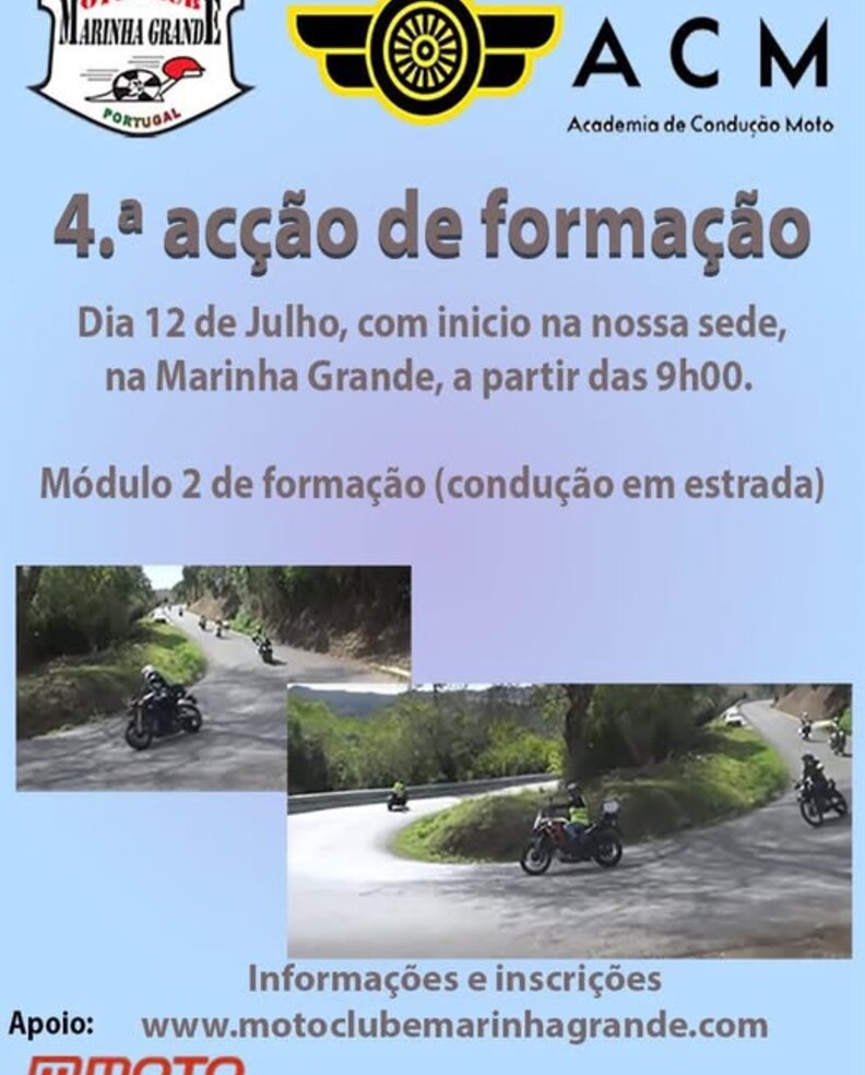 O Moto Clube da Marinha Grande, em parceria com a Academia de Condução Moto (ACM), realiza no próximo dia 12 de julho a 4.ª ação de formação, com início marcado para as 9h00, na sede do clube, localizada na Marinha Grande.