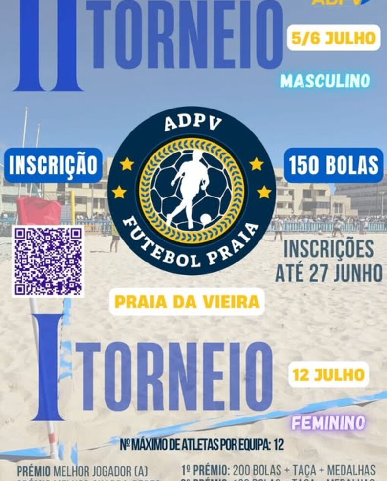 A Associação Desportiva Praia da Vieira (ADPV) vai organizar dois torneios de Futebol de Praia, um masculino, nos dias 5 e 6 de julho, e outro feminino, no dia 12 de julho, ambos a decorrer na Praia da Vieira.