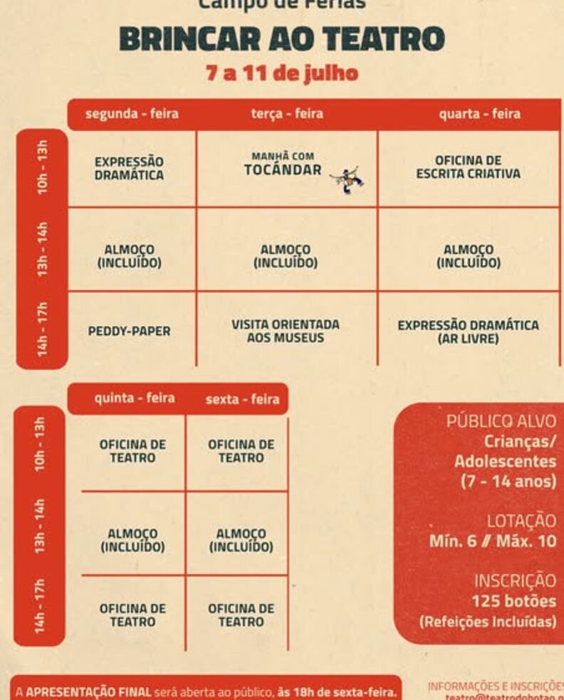 Especialmente pensada para os mais novos, esta aventura cultural explora várias expressões artísticas numa semana: para além da expressão dramática (ou não fosse esta uma atividade do Teatro do Botão!), vamos promover atividades ao ar livre (como um peddy-paper e visitas aos museus da cidade), trabalhos manuais, escrita criativa e até percurssão com a ajuda do @paulotojeira do @tocandar