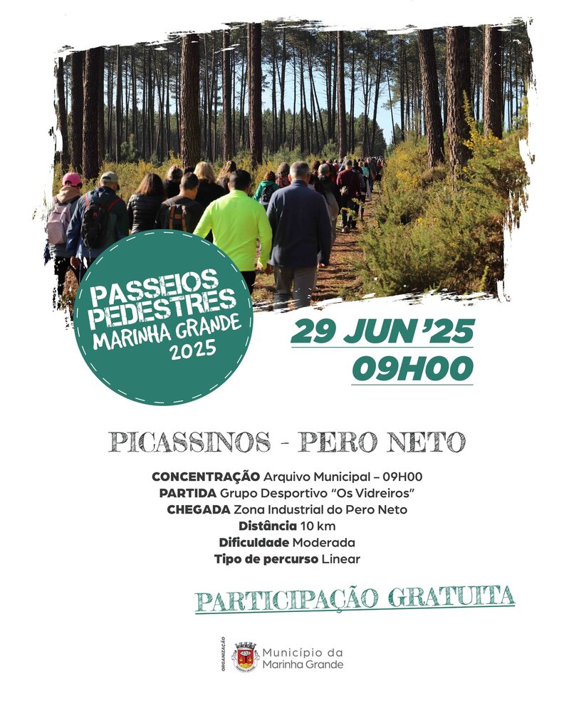 O Município da Marinha Grande vai realizar no próximo dia 29 de junho de 2025, mais um Passeio Pedestre, com início no Grupo Desportivo “Os Vidreiros” (parque de estacionamento) e fim na Zona Industrial do Pero Neto.