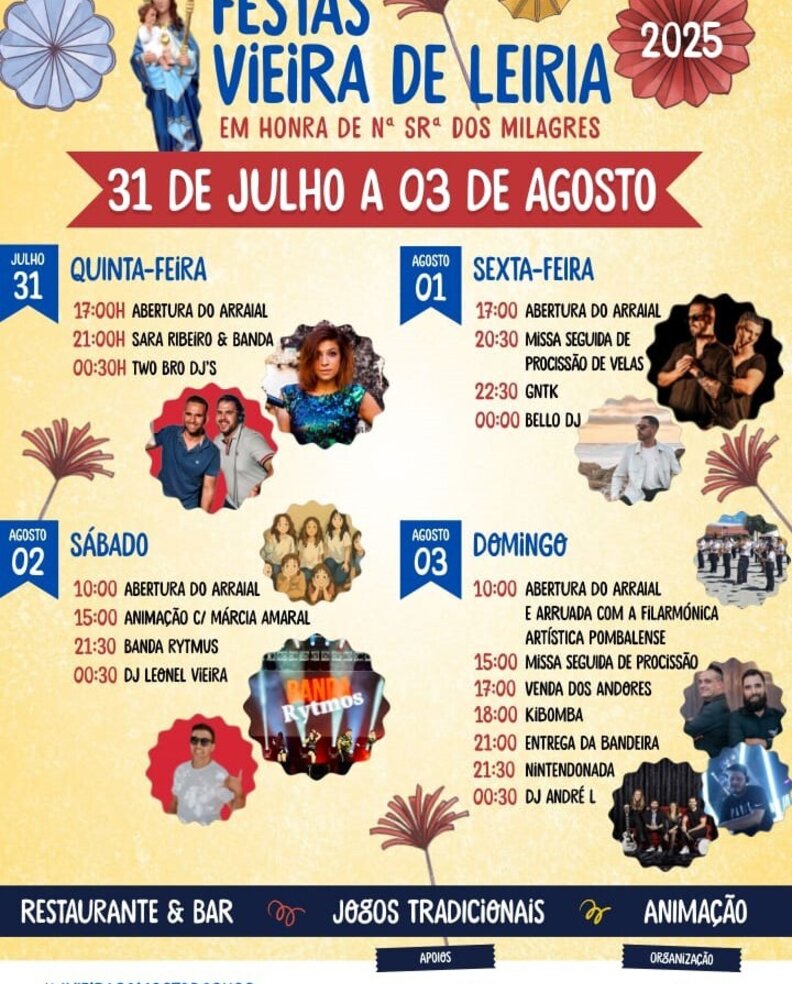 A localidade de Vieira de Leiria volta a celebrar em grande as tradicionais festas em honra de Nossa Senhora dos Milagres, entre os dias 31 de julho e 3 de agosto de 2025. O evento promete animação, música, gastronomia e tradição, num ambiente pensado para todas as idades.