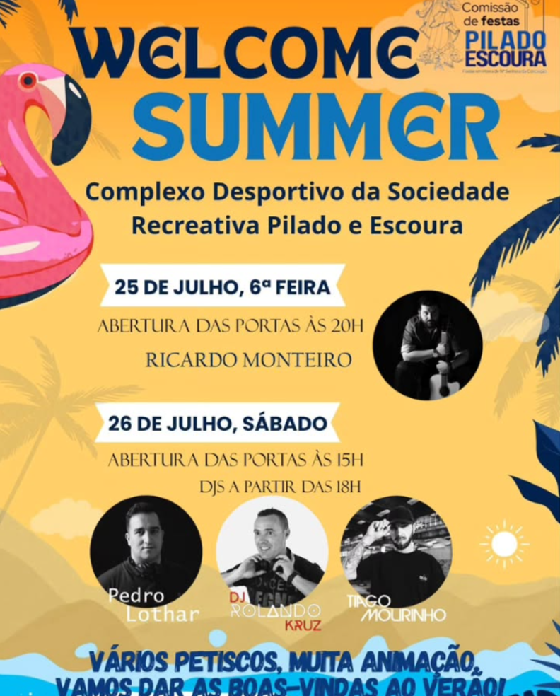 A Comissão de Festas de Pilado e Escoura prepara um fim de semana cheio de música, animação e petiscos no Complexo Desportivo da Sociedade Recreativa Pilado e Escoura. O evento “Welcome Summer” promete marcar o arranque da estação com muita energia e diversão.