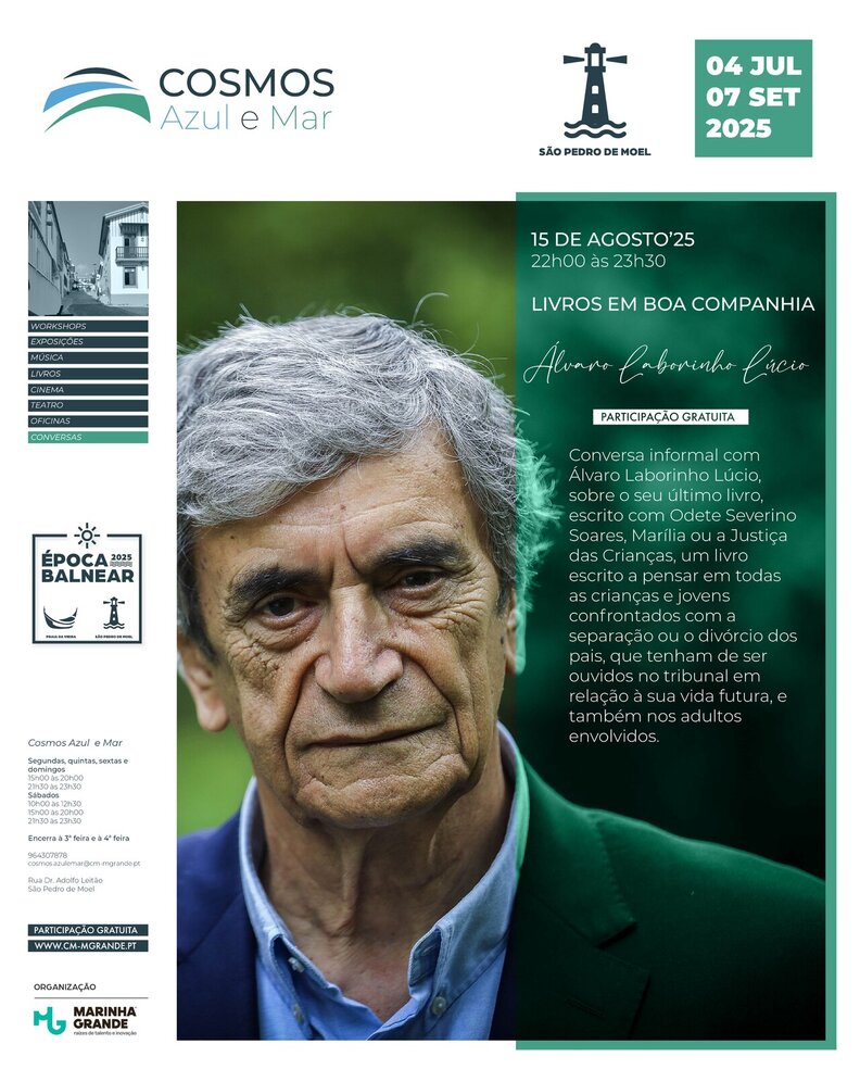 O Edifício Cosmos Azul & Mar, em São Pedro de Moel, recebe no dia 15 de agosto de 2025, às 22h00, a iniciativa “Livros em Boa Companhia”, com a presença do juiz jubilado, escritor e ex-ministro da Justiça Álvaro Laborinho Lúcio.