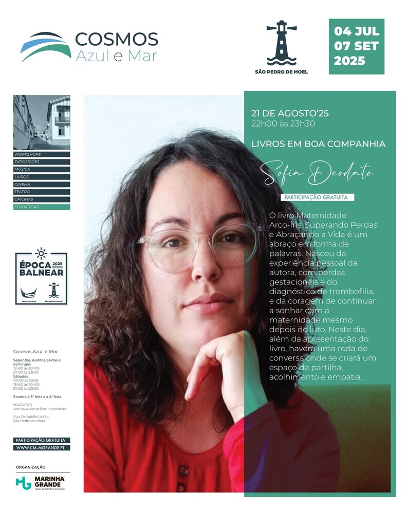 No próximo dia 21 de agosto de 2025, às 22h00, o Edifício Cosmos Azul e Mar, em São Pedro de Moel, recebe mais uma sessão do ciclo “Livros em Boa Companhia”, desta vez com a participação da autora Sofia Deodato.