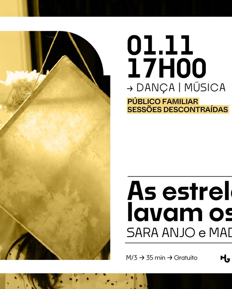 Esta obra de Sara Anjo (Bailarina) e Madalena Palmeirim (Música) une as duas disciplinas artísticas, num espetáculo dedicado ao público familiar, com sessão descontraída. As Estrelas Lavam Os Teus Pés é um momento onde a beleza e uma banda sonora onírica se juntam a imagens, aos corpos das intérpretes em movimento, numa experiência que criará momentos de contemplação, necessários nas vidas agitadas das famílias.