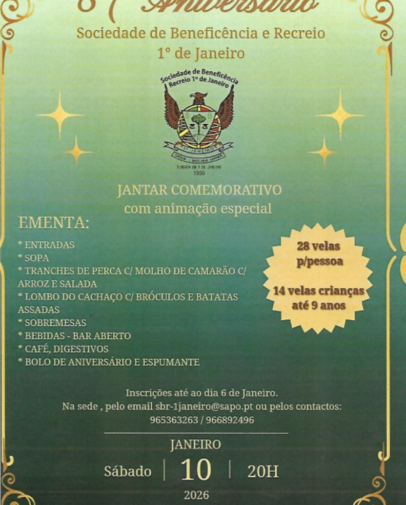 Ementa: entradas, sopa, peixe e carne, sobremesas, bolo e espumante! Bar aberto e muita diversão!