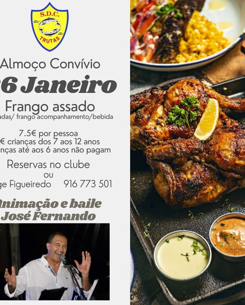 Almoço Convívio promovido pela S.D.C. Trutas, a realizar‑se no dia 26 de janeiro. O menu inclui frango assado, com entradas, acompanhamento e bebida. O valor é de 7,50€ por pessoa, 4€ para crianças dos 7 aos 12 anos, sendo que crianças até aos 6 anos não pagam. O evento conta ainda com animação e baile com José Fernando, sendo ilustrado com imagem de frango assado servido com acompanhamentos e molhos.