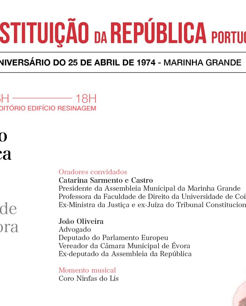 A sessão contará com as intervenções de Catarina Sarmento e Castro, Professora da Faculdade de Direito da Universidade de Coimbra, Presidente da Assembleia Municipal da Marinha Grande, ex‑Ministra da Justiça e ex‑Juíza do Tribunal Constitucional; e de João Oliveira, advogado, Deputado ao Parlamento Europeu, Vereador da Câmara Municipal de Évora e ex‑Deputado da Assembleia da República.