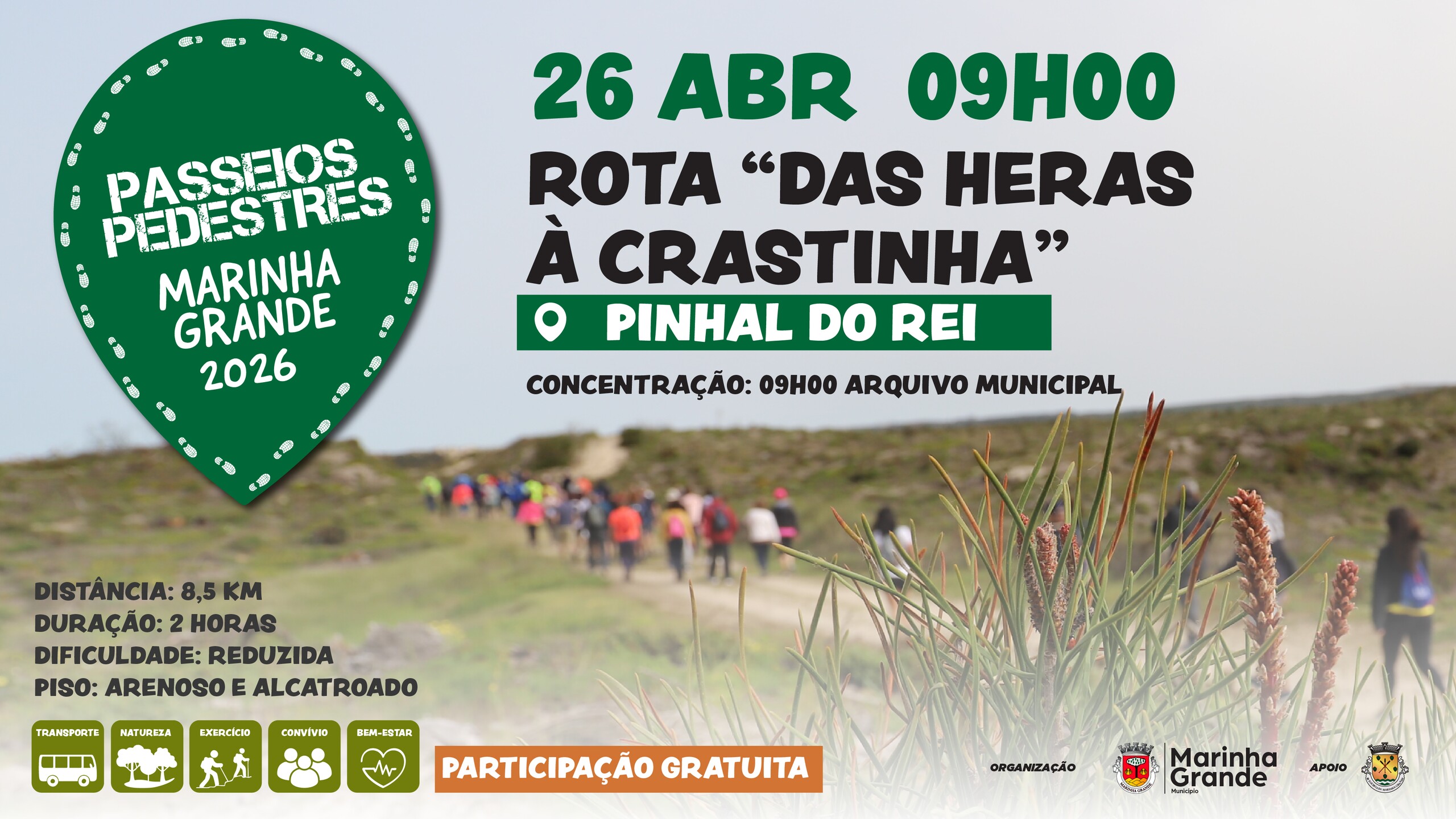 O Município da Marinha Grande vai retomar os passeios pedestres no concelho, após o período de interrupção motivado pela tempestade Kristin, assinalando este regresso com a realização da “Rota das Heras à Crastinha”, no próximo dia 26 de abril de 2026.