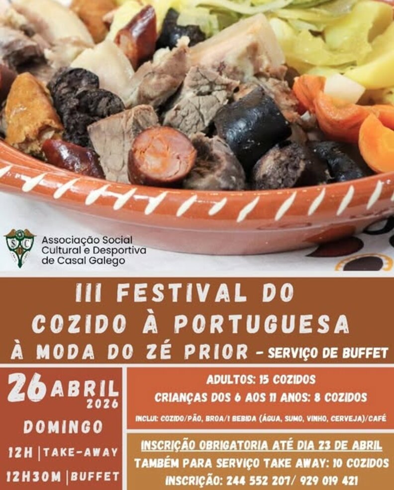 Dia 𝟮𝟲 𝙙𝙚 𝙖𝙗𝙧𝙞𝙡 (domingo) a partir das 12H - Take-away e das 12H30M - serviço Buffet, venha saborear um verdadeiro Cozido à Portuguesa à moda do Zé Prior, feito com tradição, carinho e com um grande propósito: ajudar a Associação de Casal Galego, no serviço que presta à Comunidade.