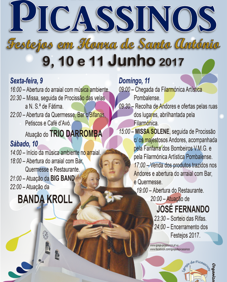 Picassinos estará em festa em honra do seu padroeiro, Santo António, nos próximos dias 9, 10 e 11 de junho, do programa do evento há a destacar a animação musical que alegrará o arraial durante os três dias de festa, com a presença do Trio Darromba na sexta-feira, a Big Band da Marinha Grande e a Banda Kroll no Sábado, e no Domingo a atuação do organista José Fernando.