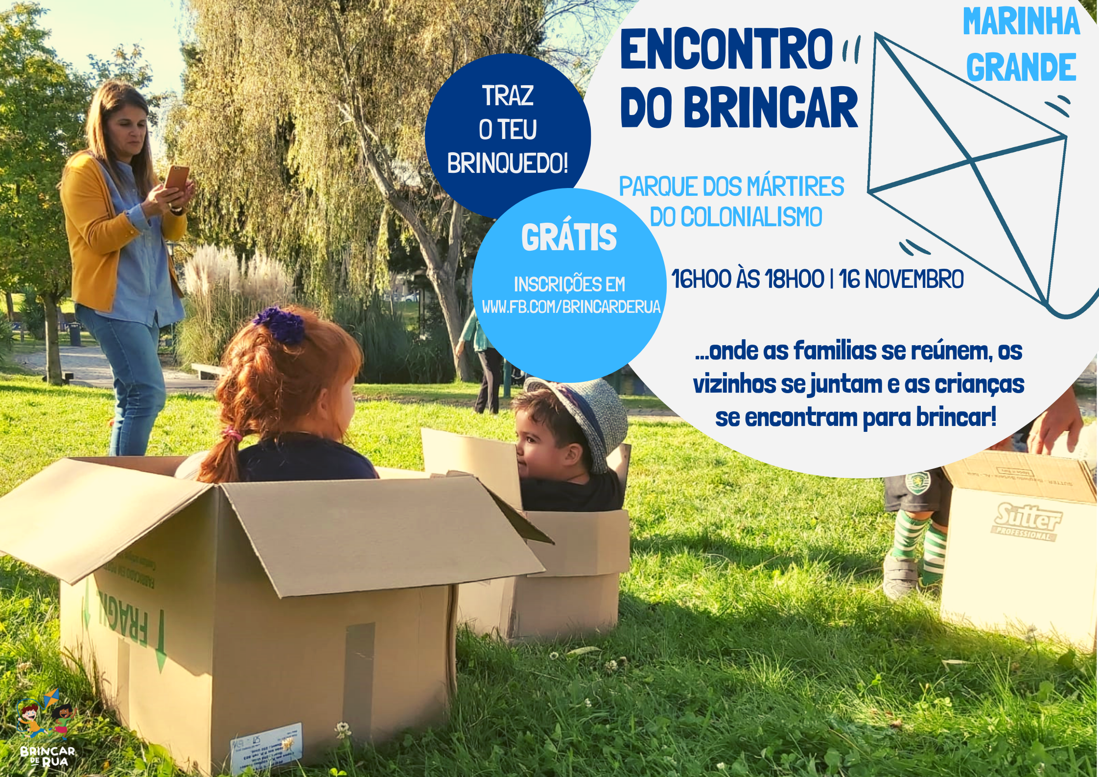 Tarde cheia de brincadeiras entre crianças e famílias na Marinha Grande, dia 16 de novembro, das 16h00 às 18h00, no Parque Mártires Do Colonialismo.