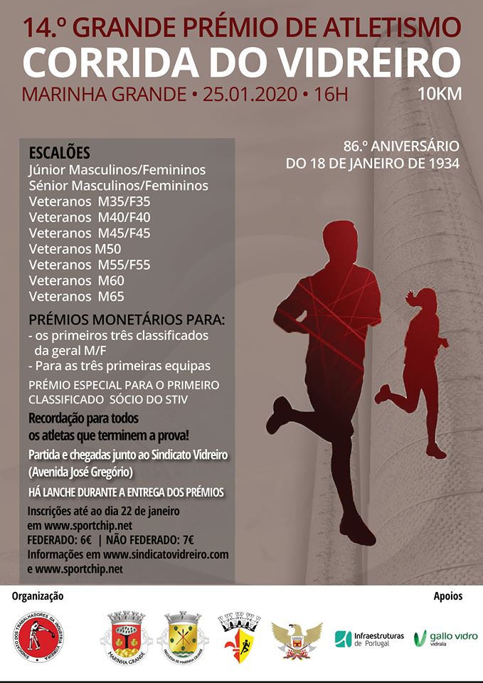 Integrado nas comemorações do 86º Aniversário do 18 DE JANEIRO DE 1934, o Sindicato dos Trabalhadores da Indústria Vidreira com o apoio da Câmara Municipal da Marinha Grande e da Junta de Freguesia da Marinha Grande, vai realizar a prova designada “CORRIDA DO VIDREIRO” no próximo dia 25 de JANEIRO de 2020 pelas 16:00.