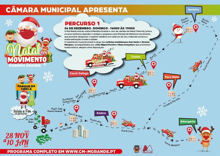 O Pai Natal está de visita à Marinha Grande e vem de camião de Natal. Para tal, juntou os seus melhores duendes e amigos e preparou uma Parada de Natal em movimento, que promete despertar o espírito natalício em cada um de nós, trazendo sorrisos e muita animação a toda a cidade.