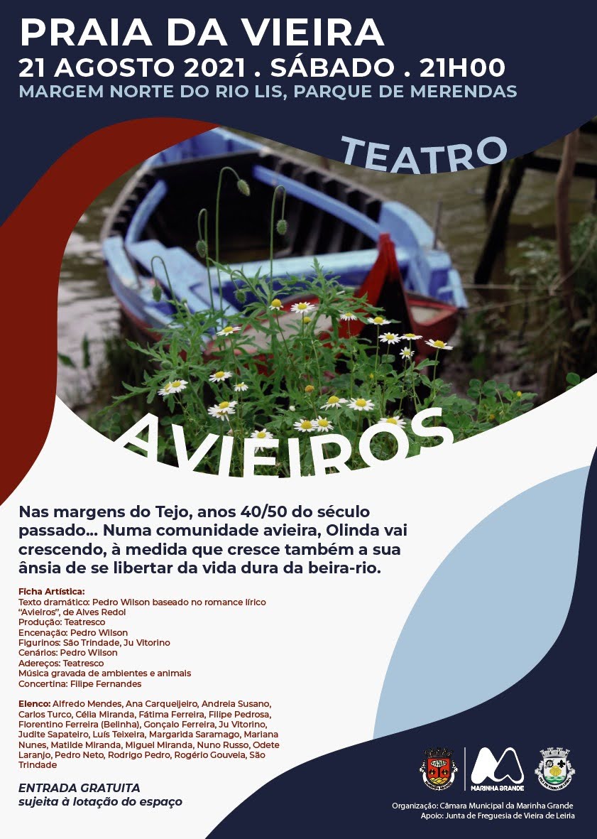 A Câmara Municipal da Marinha Grande vai apresentar a peça de teatro “Avieiros”, pelo Teatresco - Grupo de Teatro, no dia 21 de agosto (sábado), pelas 21h00, na Praia da Vieira, na margem norte do Rio Liz junto ao Parque de Merendas.