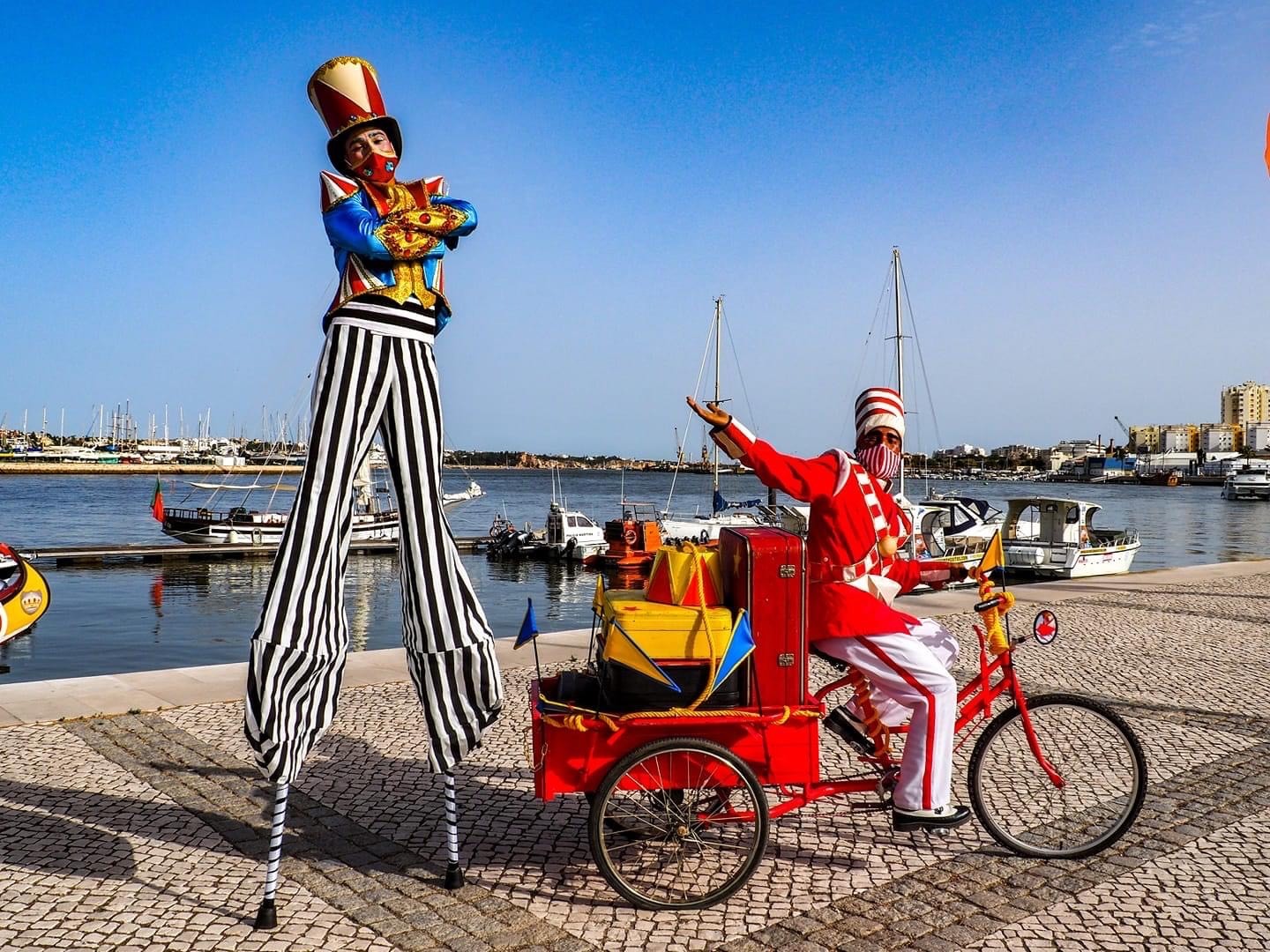 Dois animadores que andam pelo espaço a interagir com o público. Um vai numa bicicleta, é muito divertido e trapalhão, o outro vai de andas. A bicicleta tem som, toda a performance é acompanhada de música.