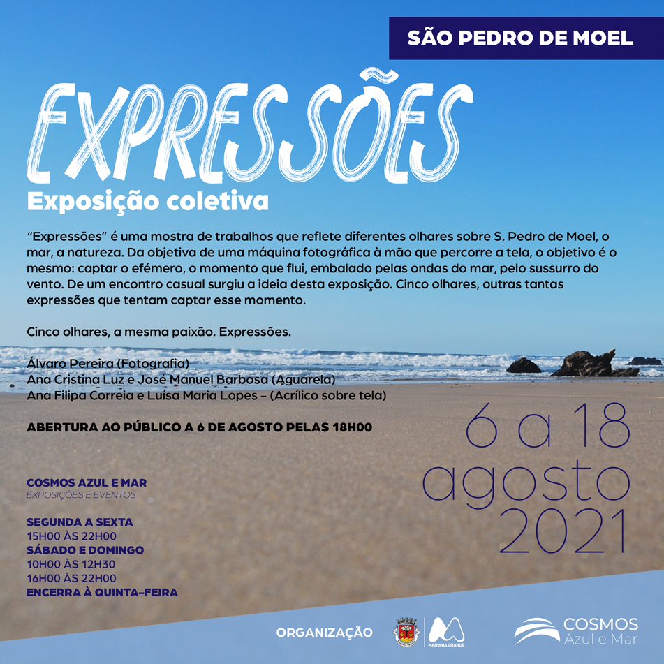 A exposição “Expressões” está patente no Cosmos Azul e Mar, de 6 a 18 de agosto, podendo ser visitadas no seguinte horário: segunda a sexta (exceto quintas-feiras) das 15h00 às 22h00; e ao sábado e domingo, das 10h00 às 12h30 e das 16h00 às 22h00. A entrada é gratuita.