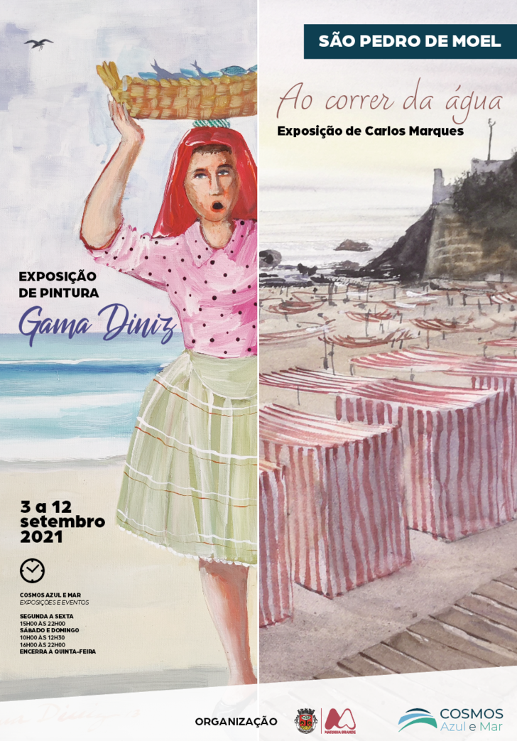 O Cosmos Azul e Mar, localizado em São Pedro de Moel, inaugura as exposições “Pintura de Gama Diniz” e “ Ao correr da água”, com aguarelas de Carlos Santos Marques, na próxima sexta-feira, 3 de setembro, pelas 18h00, que estarão patentes até ao dia 12 de setembro. A abertura das exposições será precedida com demonstração de pintura ao vivo em aguarela do artista Carlos Marques, a partir das 16h30.