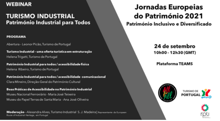 Enquadrado nas Jornadas Europeias do Património 2021, o Webinar pretende mostrar a importância da oferta inclusiva relacionada com o património industrial, no âmbito da estruturação do Turismo Industrial, bem como capacitar os gestores deste património relativamente às condições de acessibilidade física e comunicacional e partilhar boas práticas nacionais de acessibilidade deste produto turístico.