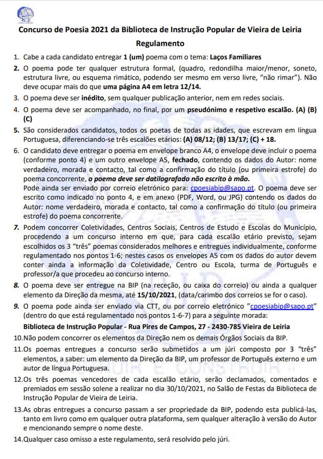 Em 2021 a BIP - Biblioteca de Instrução Popular de Vieira de Leiria volta a lançar mais um Concurso de Poesia.