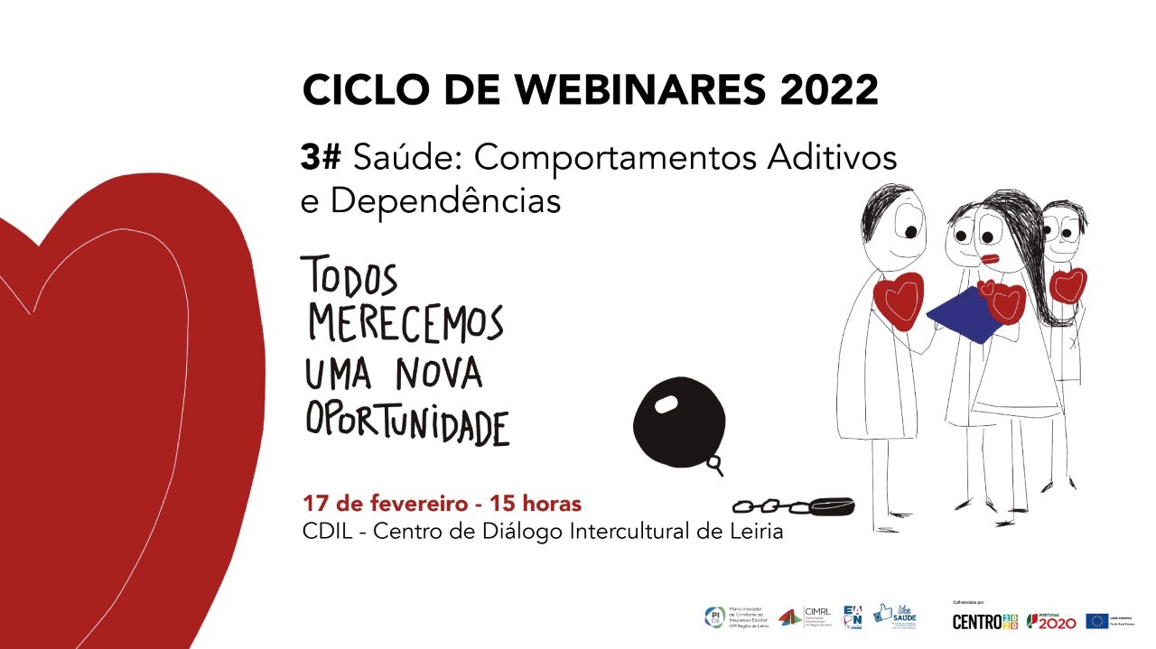 webinar 3# Saúde: Comportamentos Aditivos e Dependências, integrado num ciclo de 5 webinares de Inclusão Social, que se realiza no próximo dia 17/02, entre as 15h e as 16h30, no Centro de Diálogo Intercultural de Leiria, no âmbito do recurso pedagógico “Despir os Preconceitos, Vestir a Inclusão” - educação para a saúde e bem-estar, do projeto PICIE – Plano Inovador de Combate ao Insucesso Escolar.