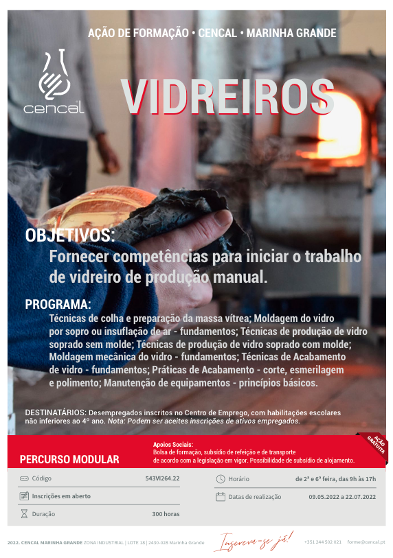 Inscreva-se gratuitamente no Percurso Modular de Vidreiros, no Cencal da Marinha Grande e receba bolsa de formação, subsídio de refeição e de transporte e possibilidade de alojamento.