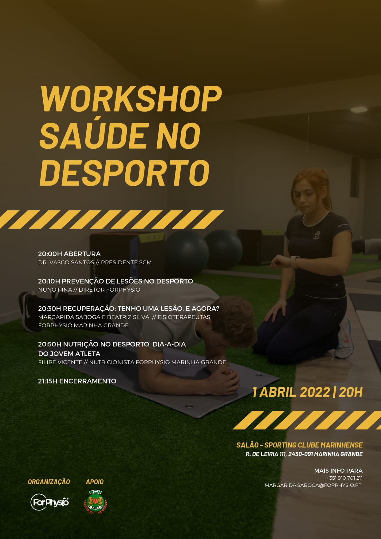 Dia 1 de Abril de 2022, pelas 20h00, realiza-se um Workshop "Saúde no Desporto", no salão do Sporting Clube Marinhense, com entrada gratuita.