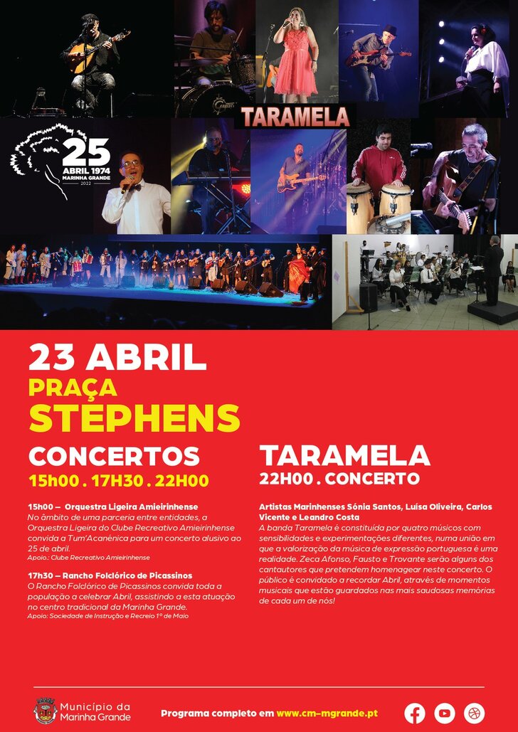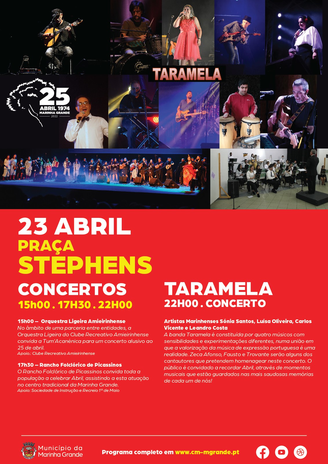 22h00 - CONCERTO COM A BANDA TARAMELA E OS ARTISTAS MARINHENSES SÓNIA SANTOS, LUÍSA OLIVEIRA, CARLOS VICENTE E LEANDRO COSTA