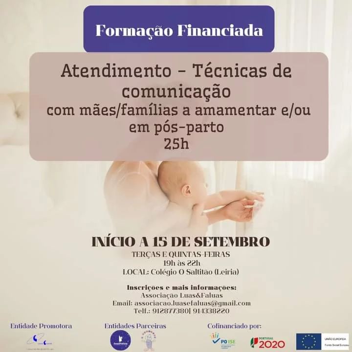 A Luas&Faluas - Associação para o Desenvolvimento Pessoal, Social e Comunitário, de mãos dadas com a Oesteconsult - Formação Consultadoria, Lda e com o Colégio O Saltitão, está a organizar o Curso Atendimento - Técnicas de comunicação (com mães/famílias a amamentar e/ou em pós-parto).