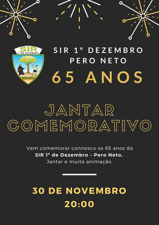 Tem lugar a 30 de novembro, pelas 20h, o jantar comemorativo dos 65 anos da SIR 1º de Dezembro - Pero Neto.